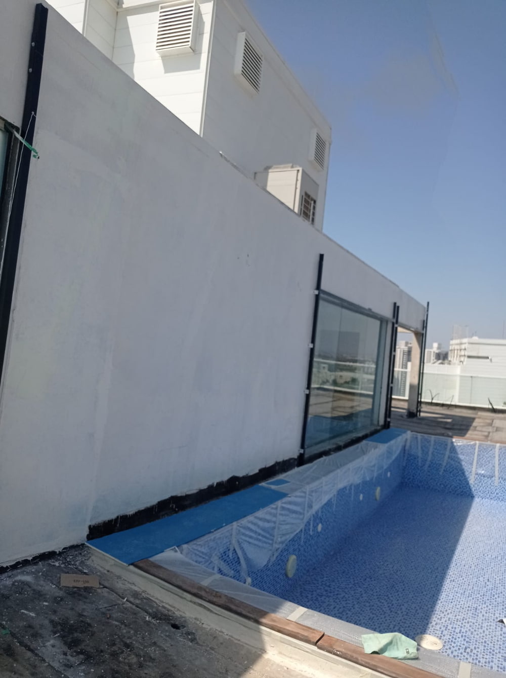 לפי פרויקט אדריכלי הקירות חיצוניים מחופים לוחות פייבר צמנט בגוון אפור כהה. מבנה נמצא צמוד לבריכה ובאזור יש הרבה לחות ושמש. לוחות פייבר צמנט בעלי תכונות מצוינות לחיפוי במקומות איפה שיש לחות גבוהה ושמש. לוחות עמידים לכל מזג אוויר.